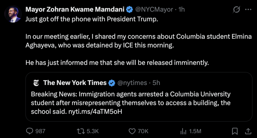 Mayor Mamdani posted that he had spoken directly with President Trump, who confirmed the student would be released “imminently.” Shortly after 4:15 p.m. ET, Columbia University confirmed that Aghayeva had been freed.